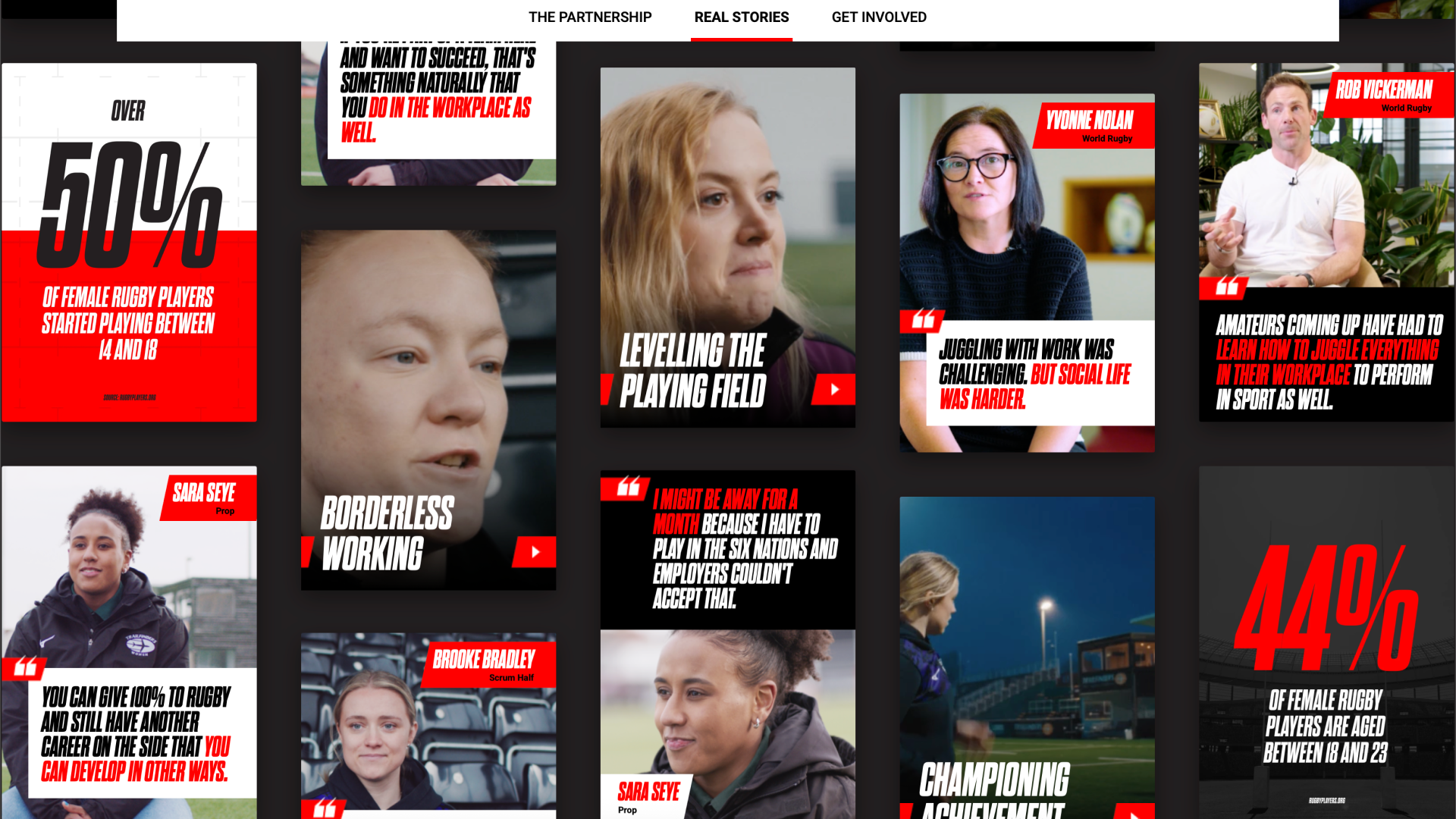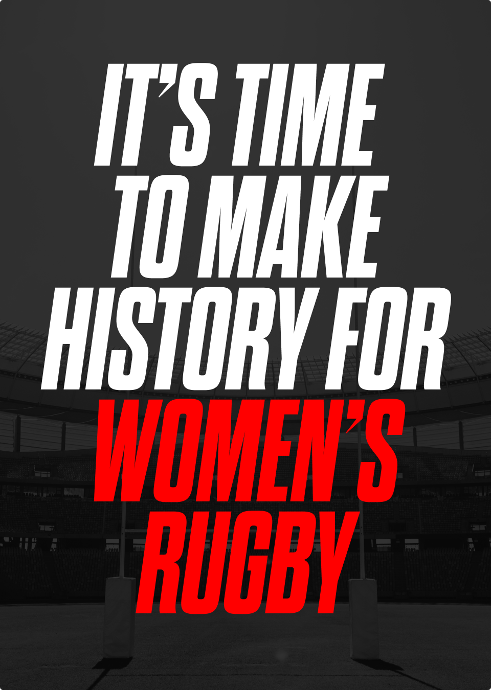 I firstly had to design a look and feel for the whole campaign and ended up using the parallel red bars for the key visual at the top of the website, for introductions to videos and elsewhere. I then created a number of videos which highlighted interviews with prominent rugby figures as well as some of the women from Ealing Trailfinders Rugby Club. These would be shown on the website as well as social media. Along side this I made animated banners to be displayed around the pitch during the matches at the world cup, a robust assortment of social media assets to be released during the event and programme ads.